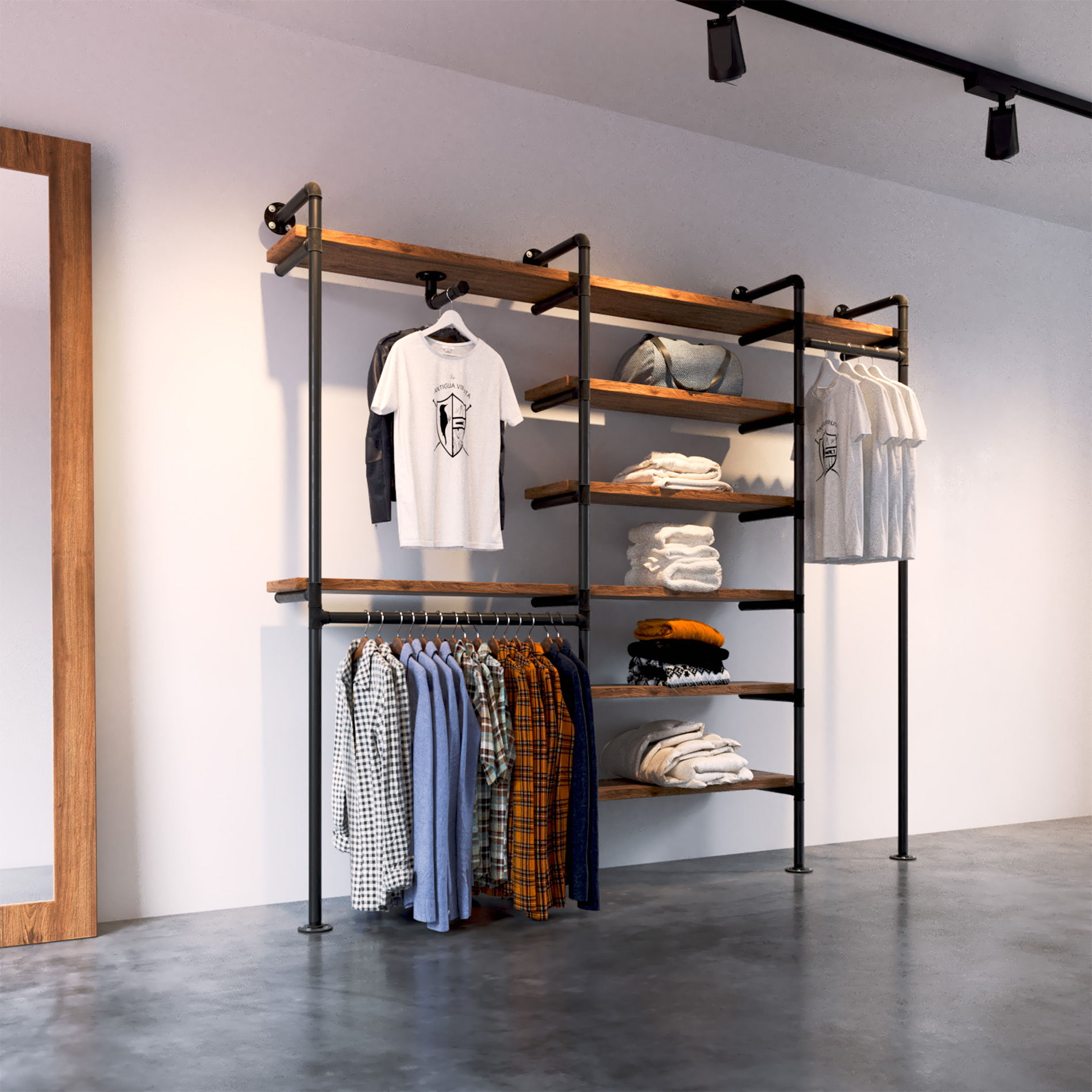 Estos colgadores de ropa se adaptan a la perfección a las necesidades de nuestros clientes. Son expositores de ropa fabricados con tubería de metal y madera maciza, creando auténticas composiciones para cualquier tipo de decoración industrial o decoración vintage.