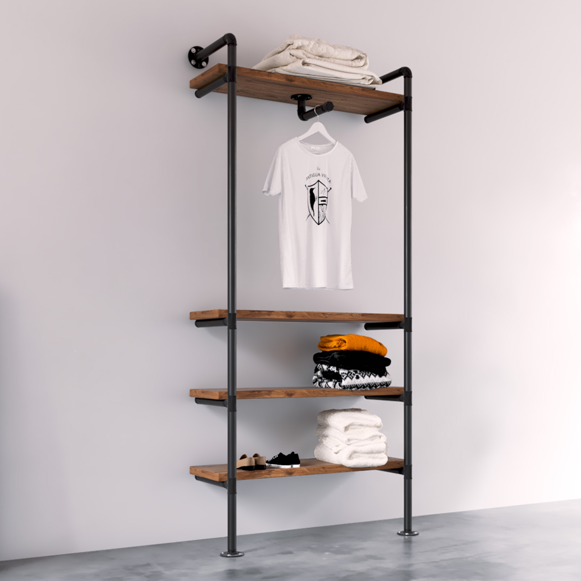 Sistema abierto en tubería metálica anclada a pared y suelo con cuatro baldas de madera maciza de alta carga y barra central para prendas destacadas. Conjunto industrial cálido/loft muy estable, ligero visualmente y preparado para uso intensivo en tienda o vestidor. La madera se termina en mate al agua de baja emisión para tacto natural y fácil limpieza.