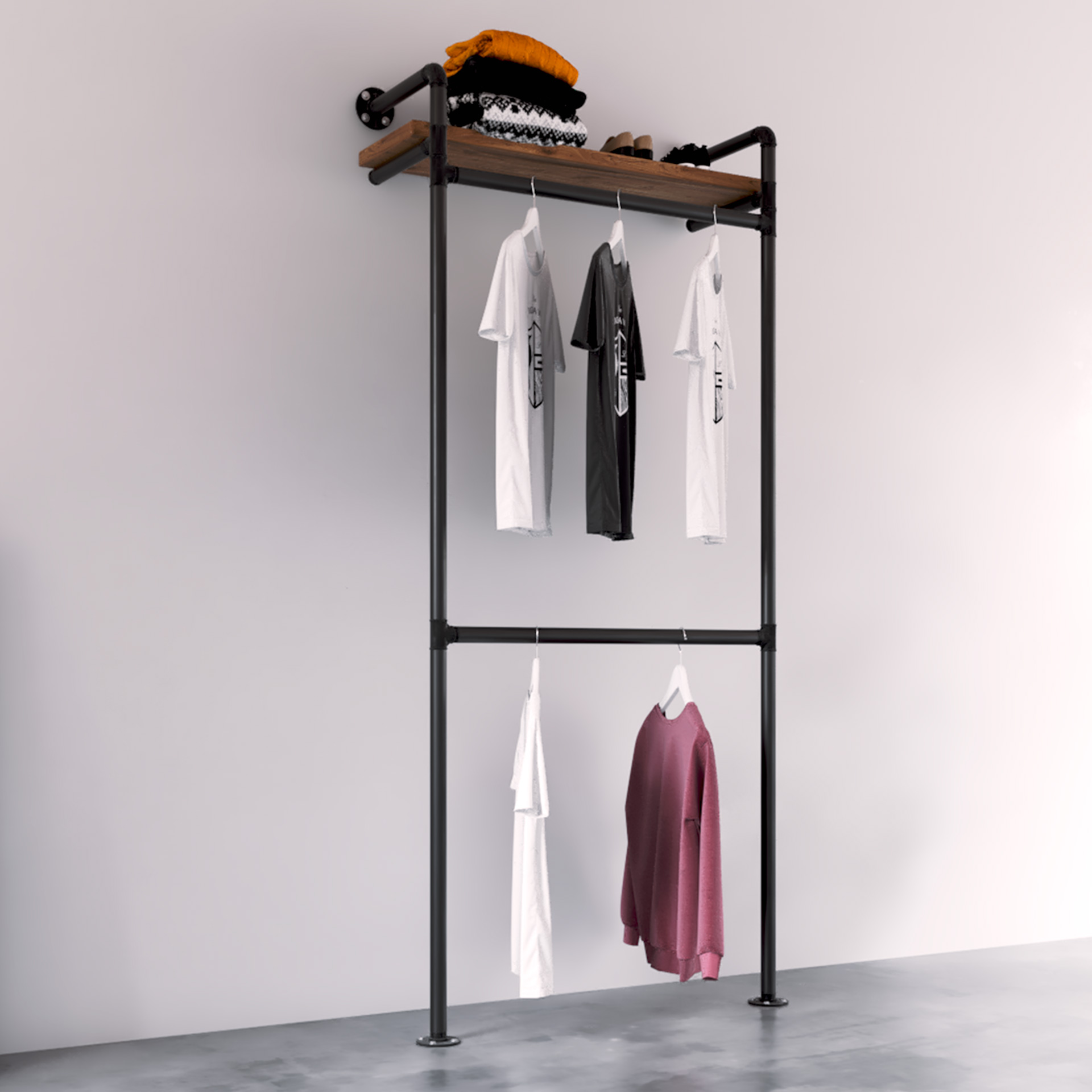 Sistema abierto en tubería metálica anclada a pared y suelo, con balda superior de madera maciza y doble barra (superior y media) para optimizar el colgado corto y medio. Conjunto muy estable y ligero visualmente, preparado para uso intensivo en tienda o vestidor. La madera se termina en mate al agua de baja emisión para tacto natural y fácil limpieza.