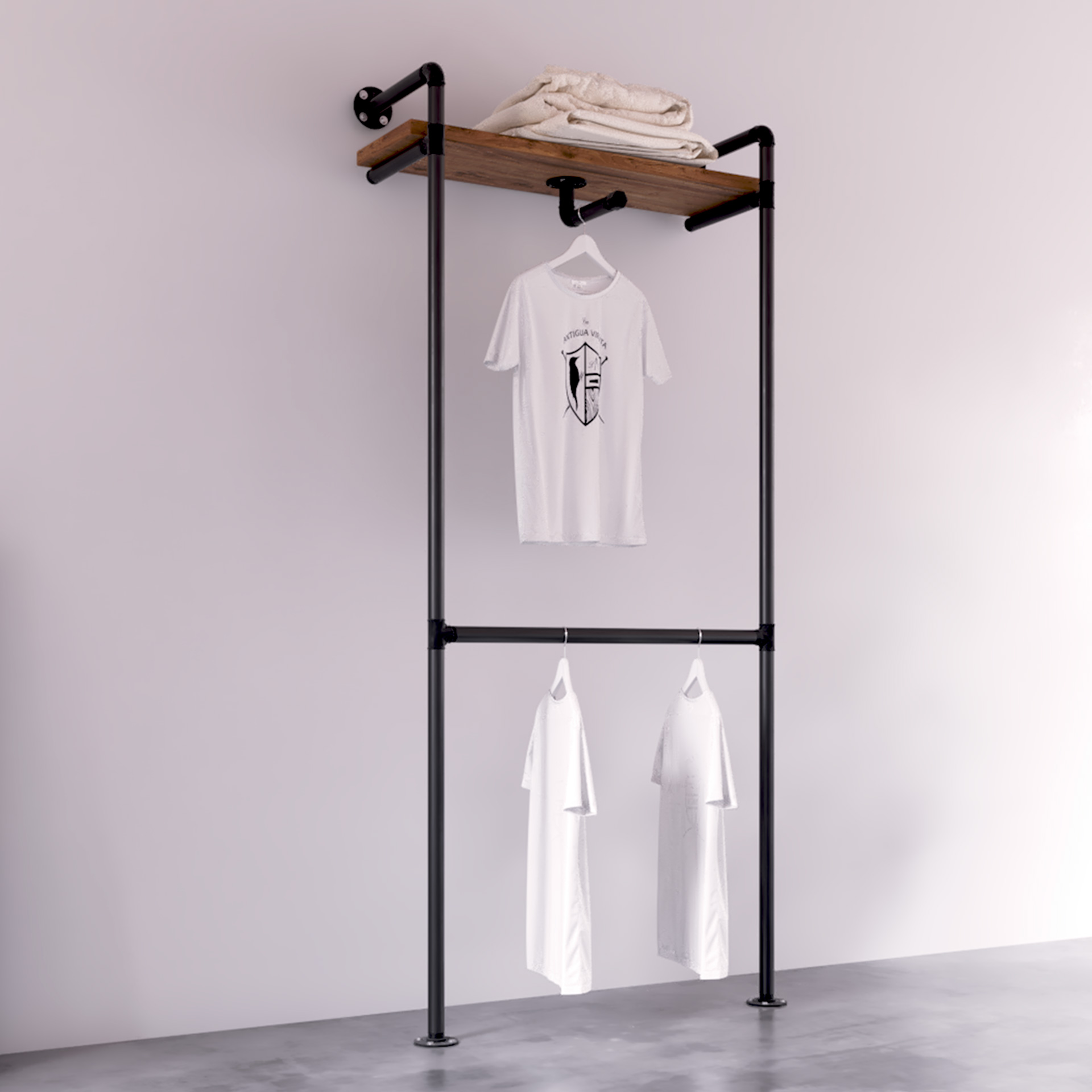 Sistema abierto en tubería metálica anclada a pared y suelo con balda superior de madera maciza, barra corta central (para destacados) y barra inferior corrida para colgado medio/largo. Conjunto muy estable y ligero visualmente, pensado para uso intensivo en tienda o vestidor. La madera se termina en mate al agua de baja emisión para tacto natural y fácil limpieza.