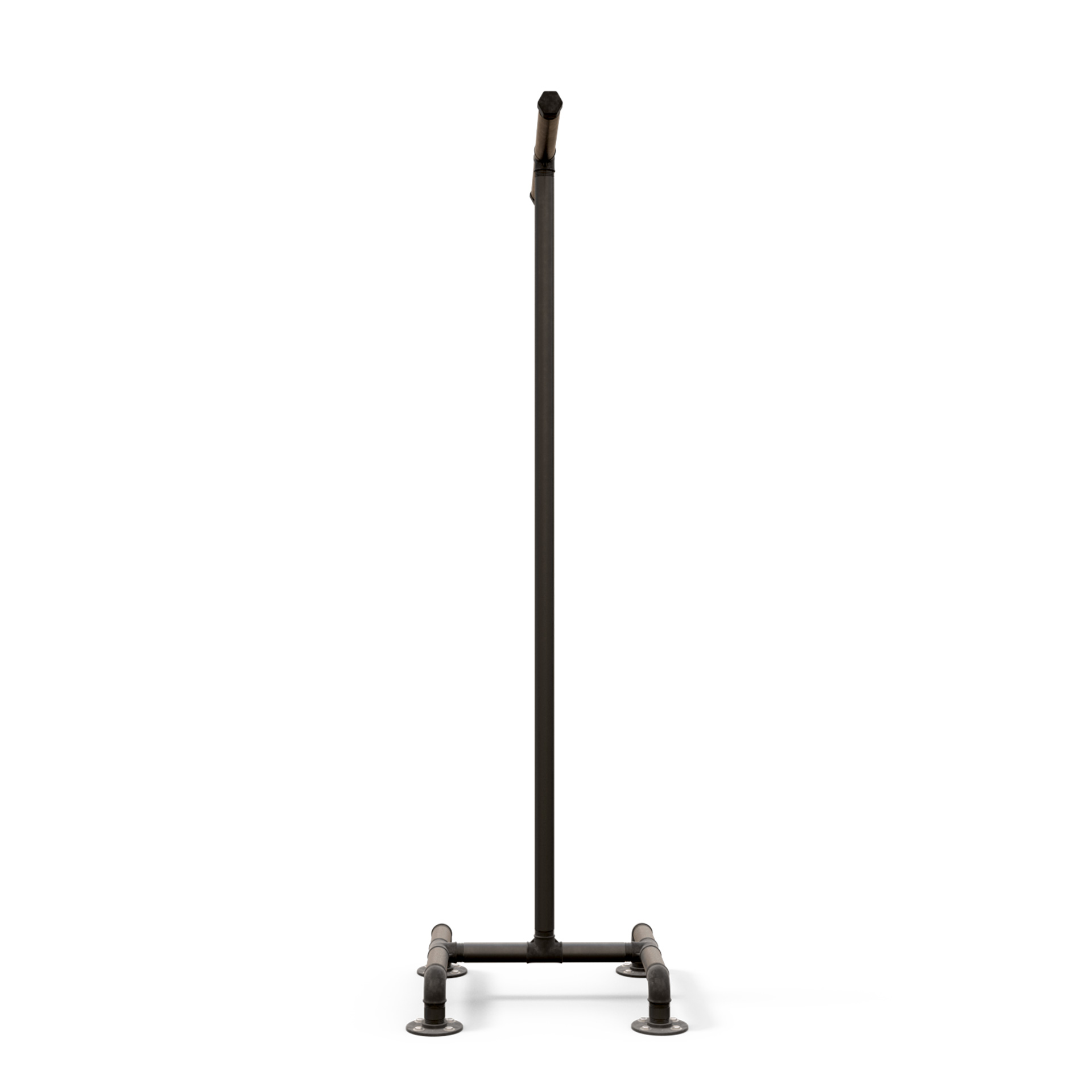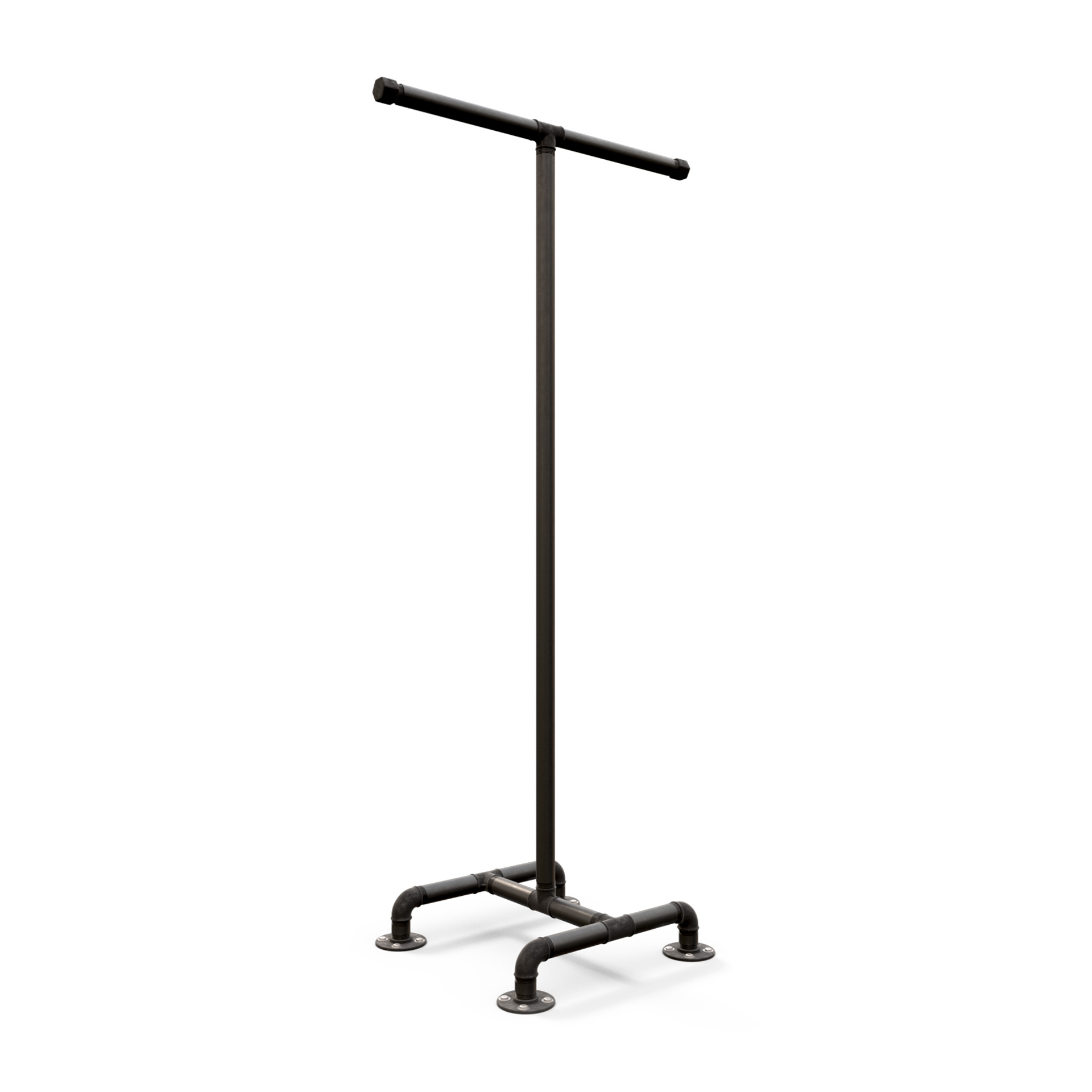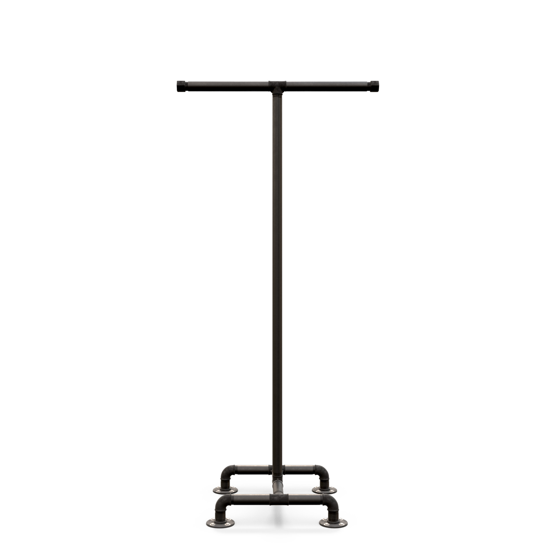 Fabricado a mano en España. Perchero expositivo de tubería vista con barra transversal en T para colgado frontal/lateral. Base compacta con huella reducida y gran estabilidad; perfecto para retail, showrooms, vestidores o probadores donde se necesita acceso 360º y rotación de prendas.