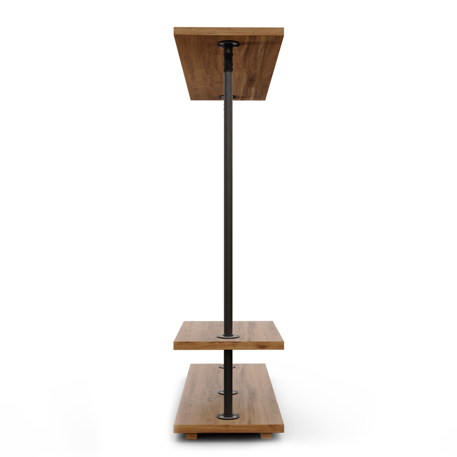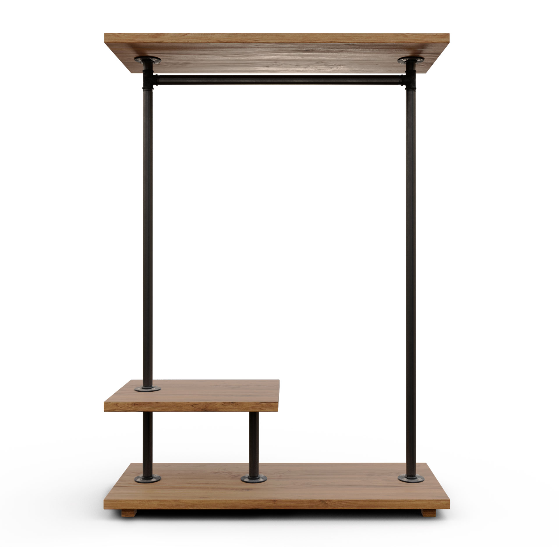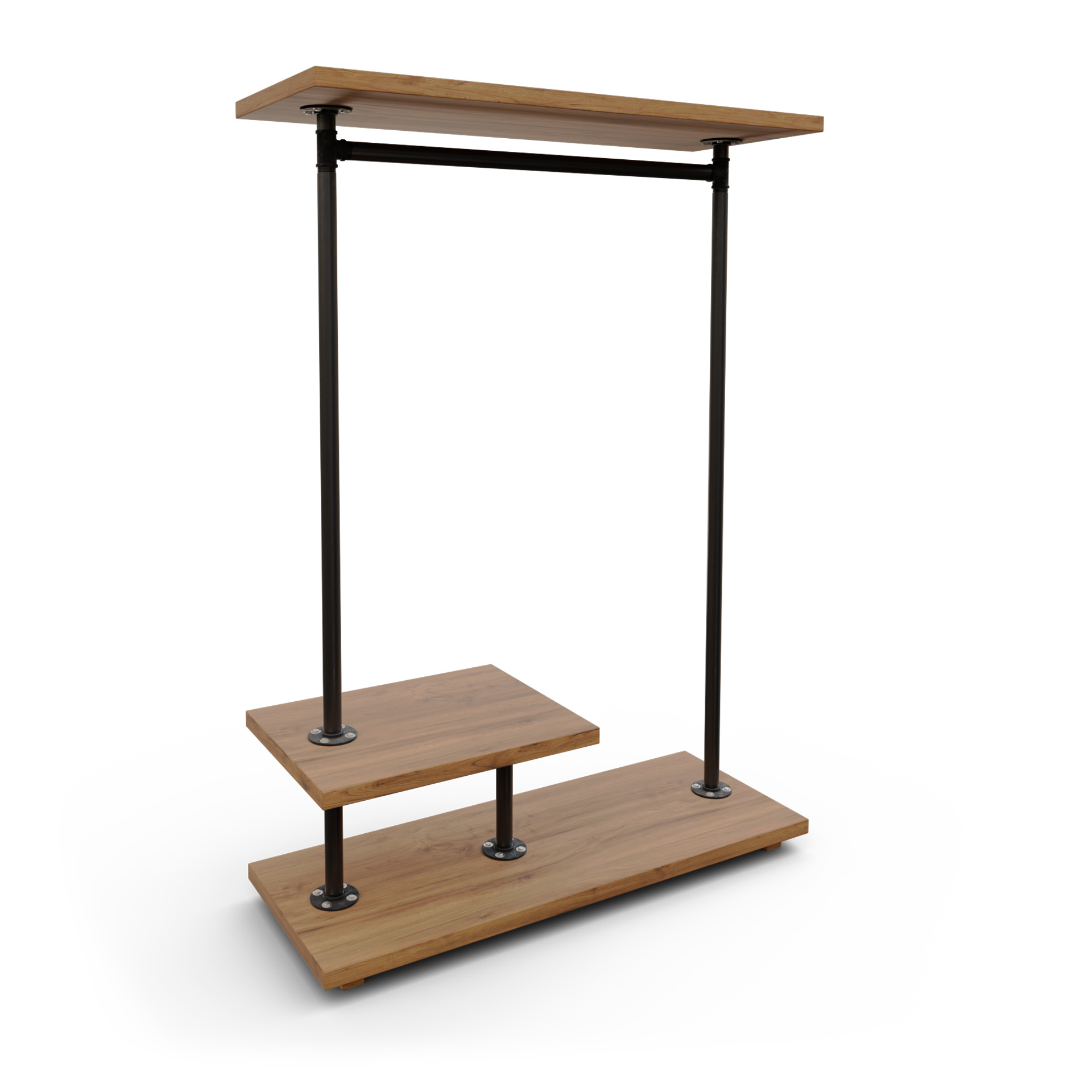 Fabricado a mano en España. Perchero autoportante de tubería vista + madera maciza, pensado para retail y showrooms. Incorpora barra superior de colgado, una peana inferior continua para calzado/bolsas y un expositor lateral en dos alturas para doblado o producto complementario. Altura cómoda de alcance, estructura limpia y muy estable para islas centrales o flancos de recorrido.
