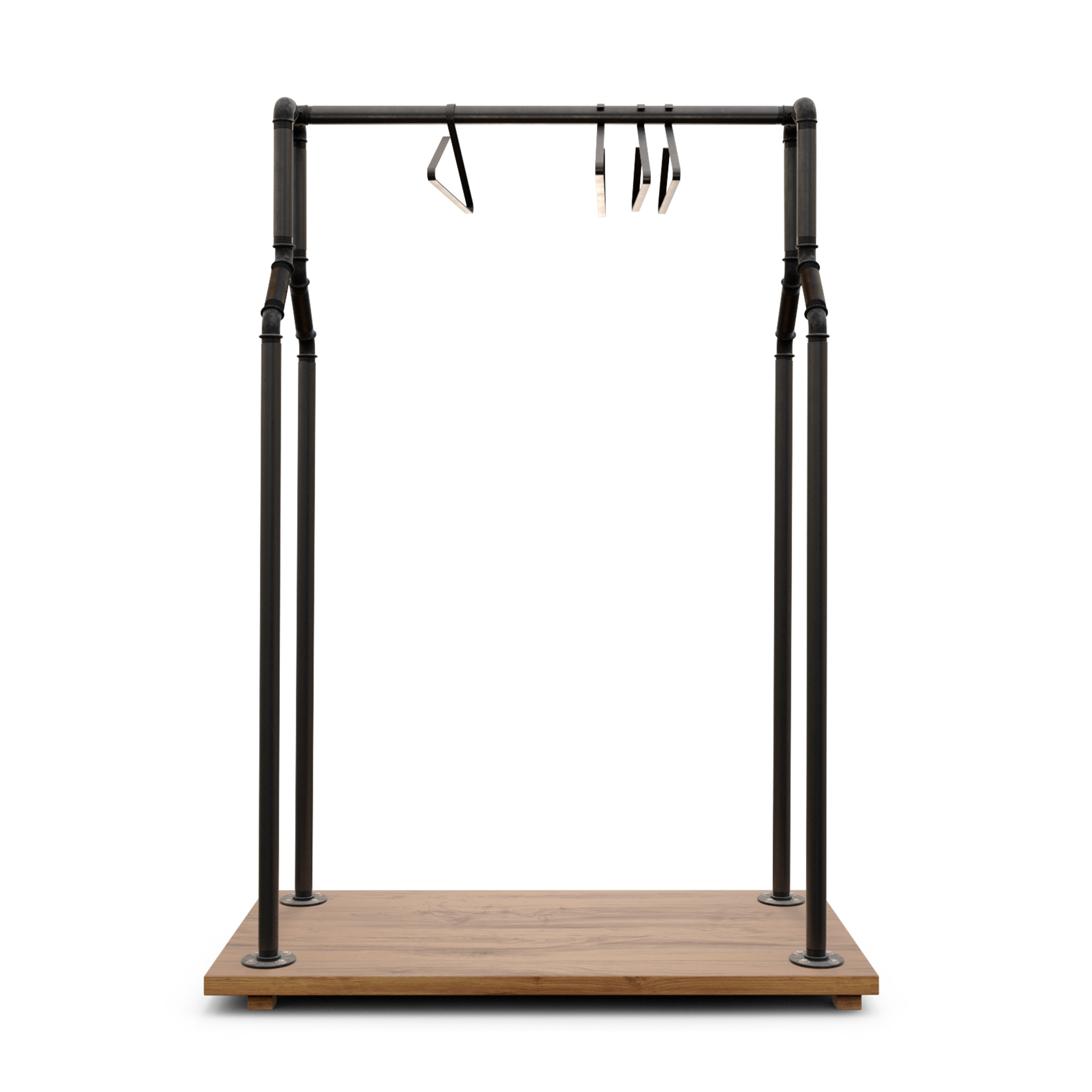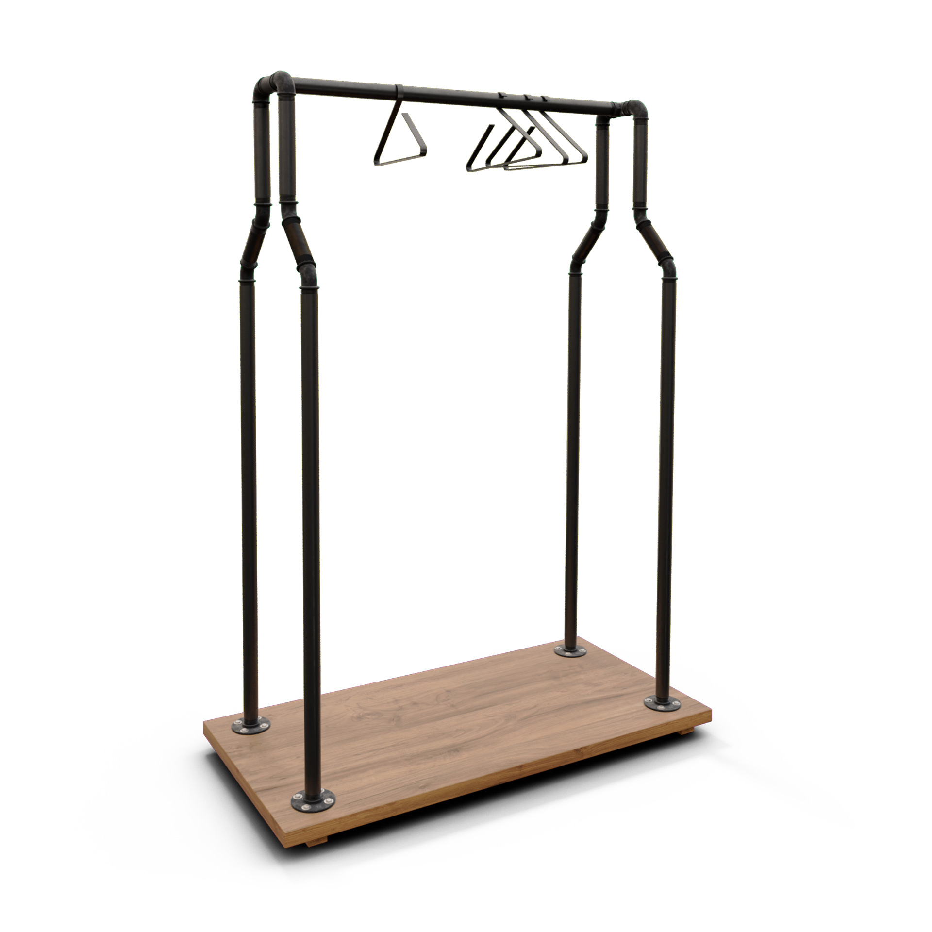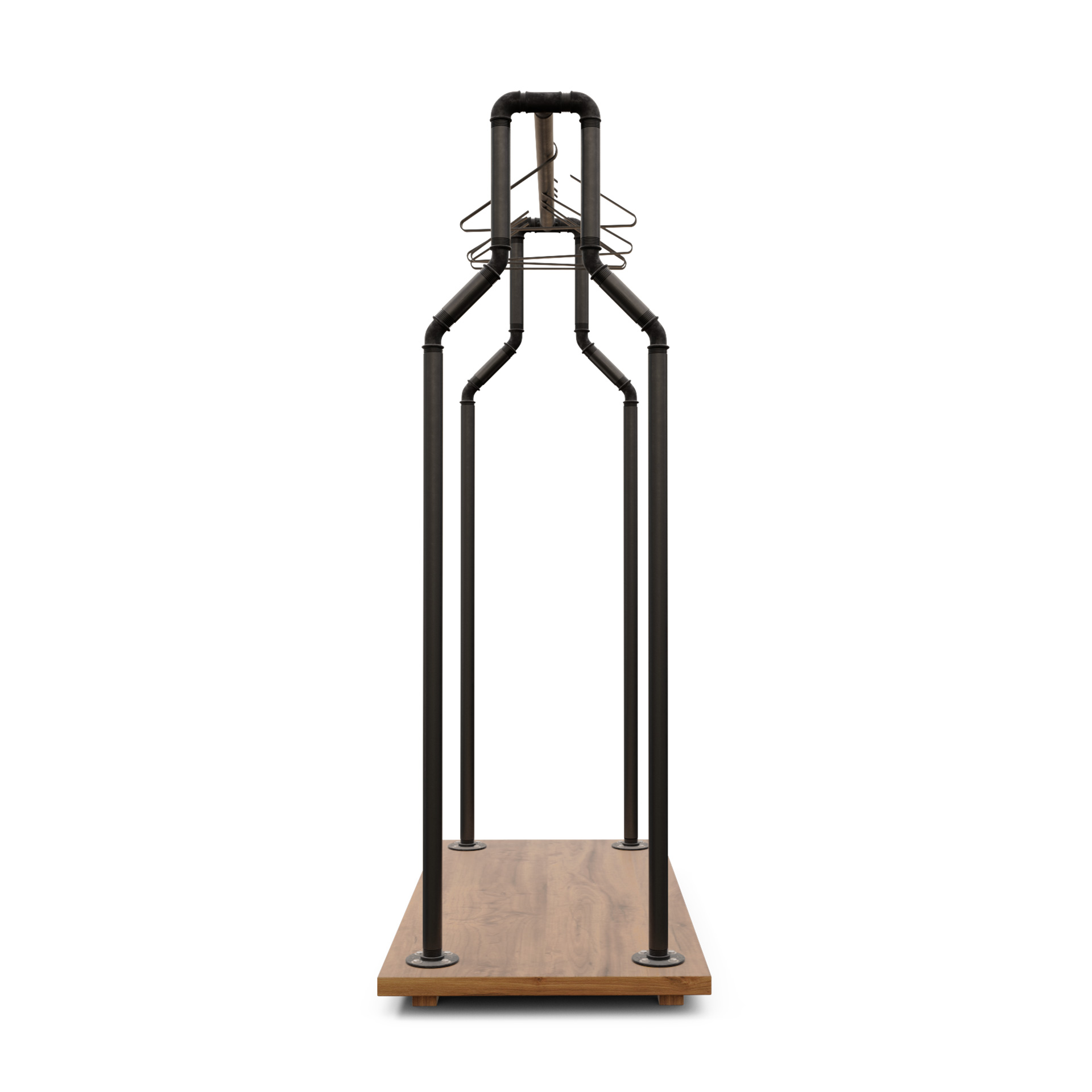 Estructura industrial cálido/loft en tubería metálica con barra superior continua y base maciza que estabiliza el conjunto y protege el suelo. Preparado para uso intensivo en tienda, showroom o vestidor; se desplaza fácil y mantiene una presencia limpia y profesional.