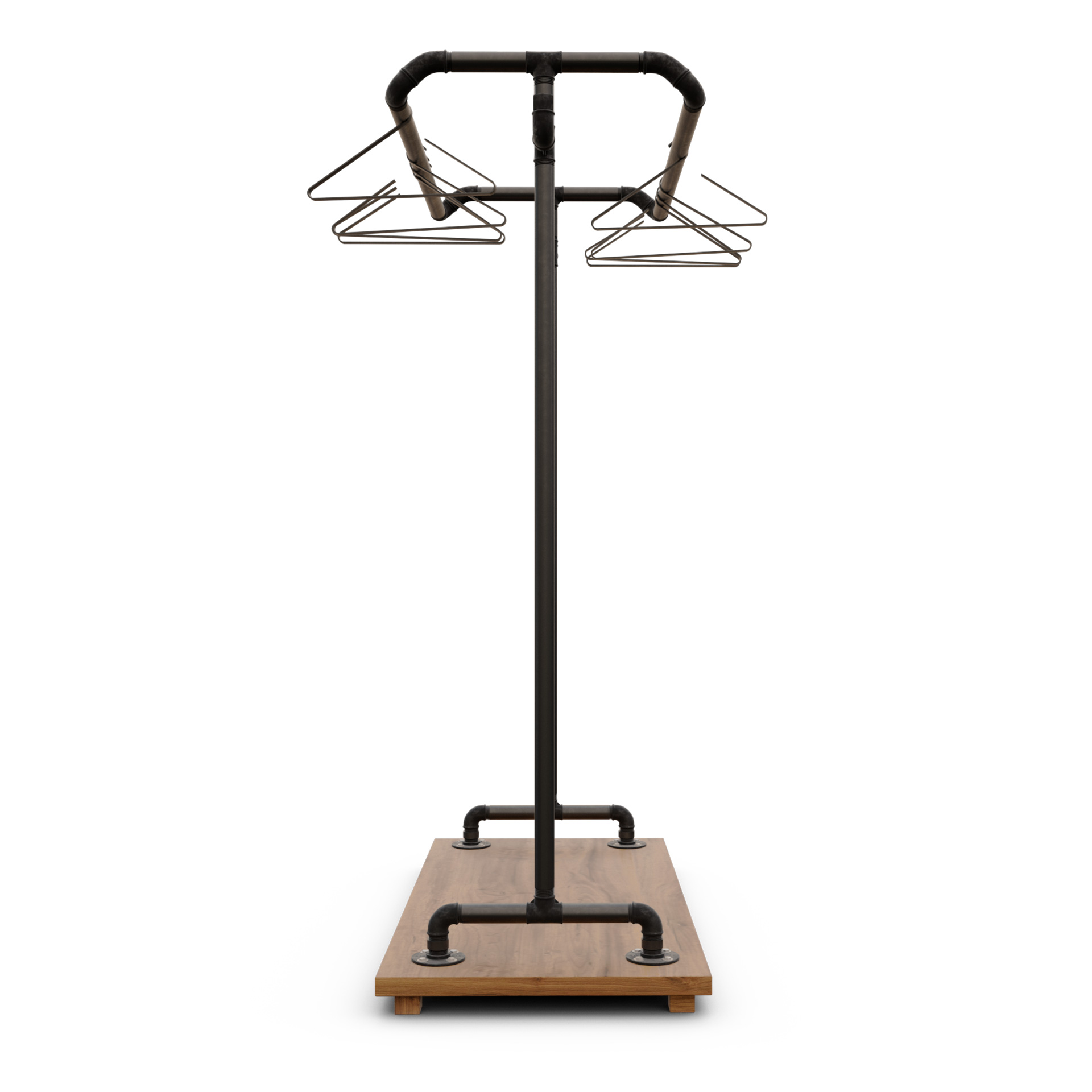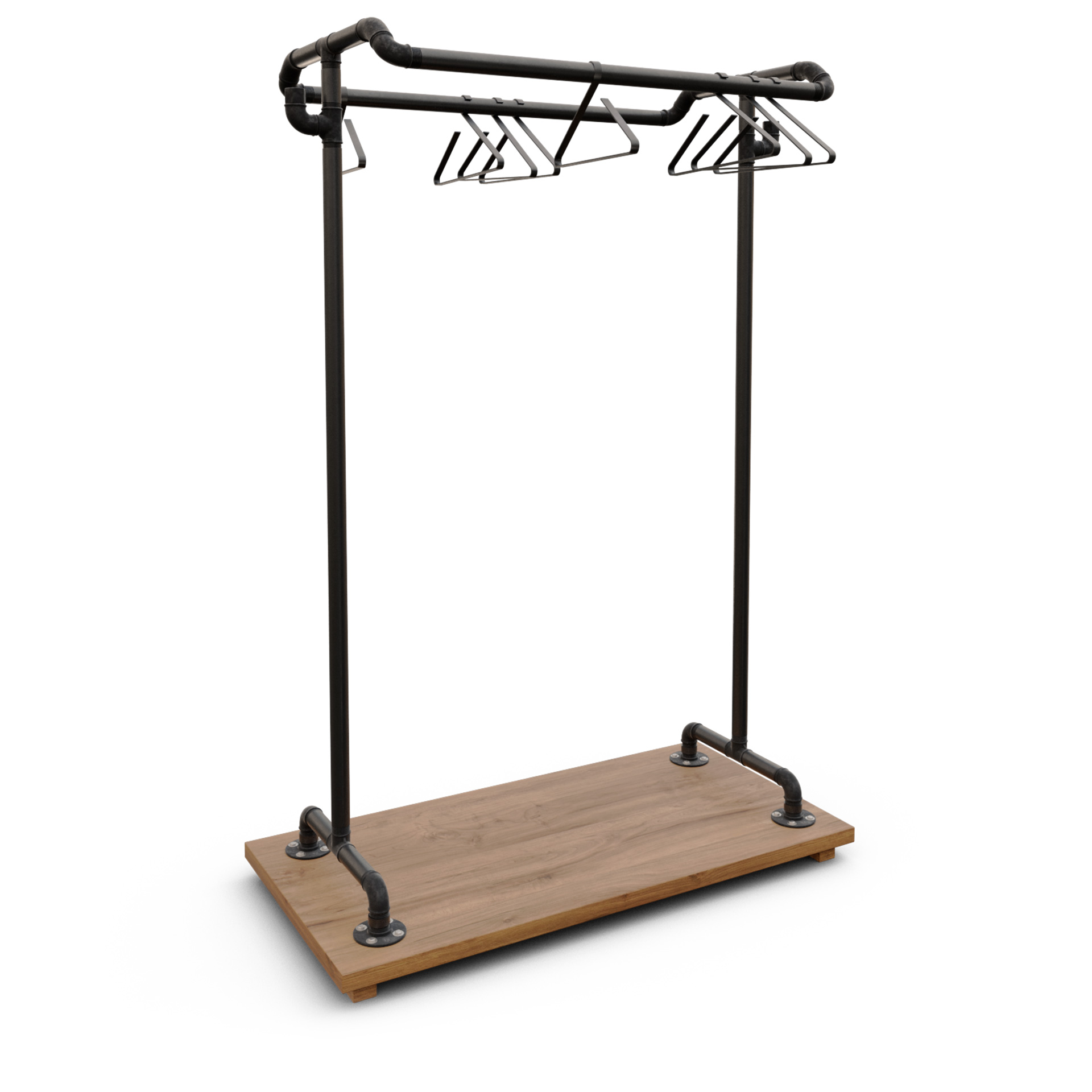 Fabricado a mano en España. Estructura industrial cálido/loft en tubería metálica con doble barra superior continua para colgado y base maciza que aporta estabilidad, protege el suelo y permite mover el conjunto con facilidad (opción ruedas). Solución robusta y limpia para tiendas, showrooms, pop-ups o vestidores domésticos. Acabado de la madera en mate al agua de baja emisión (tacto natural y fácil limpieza).