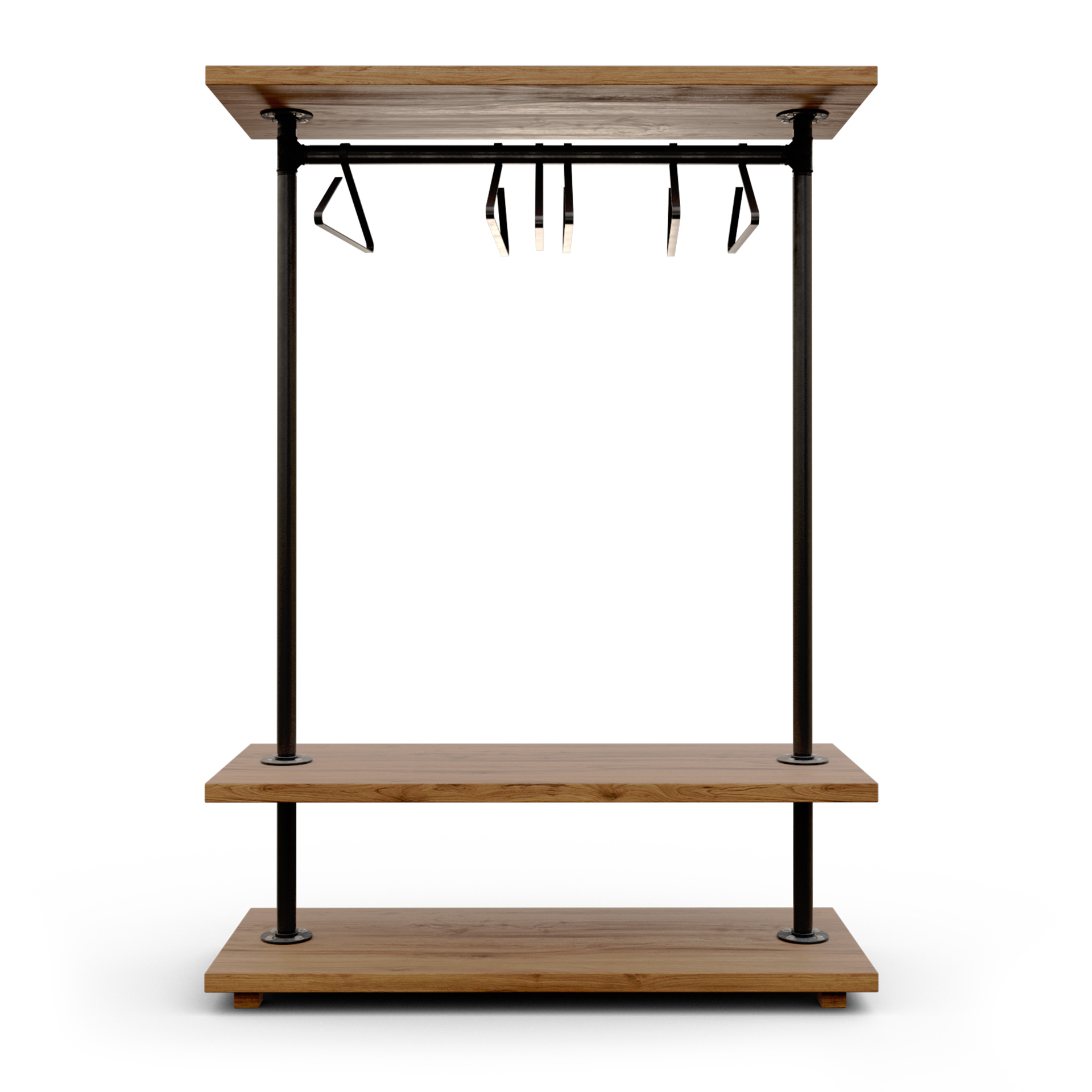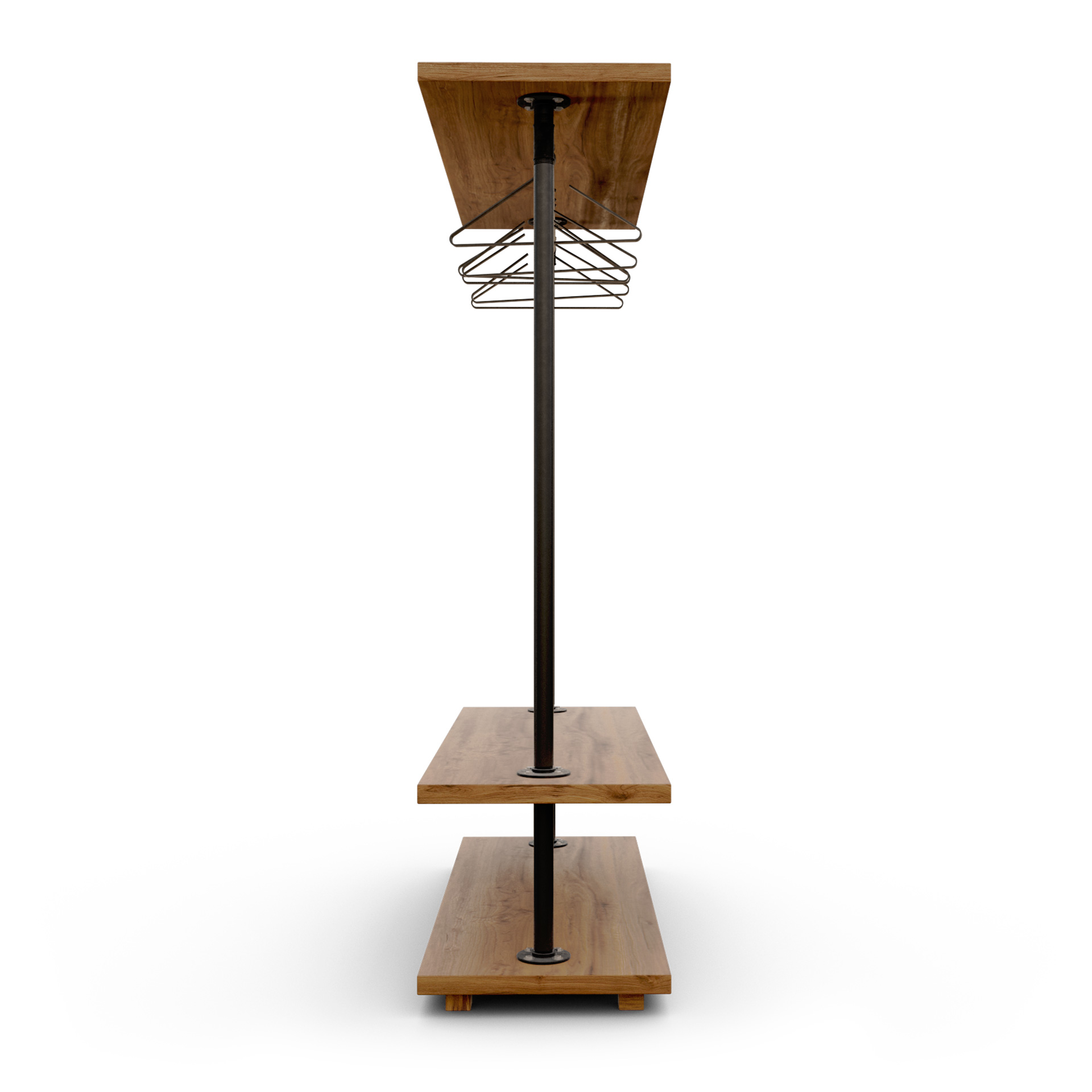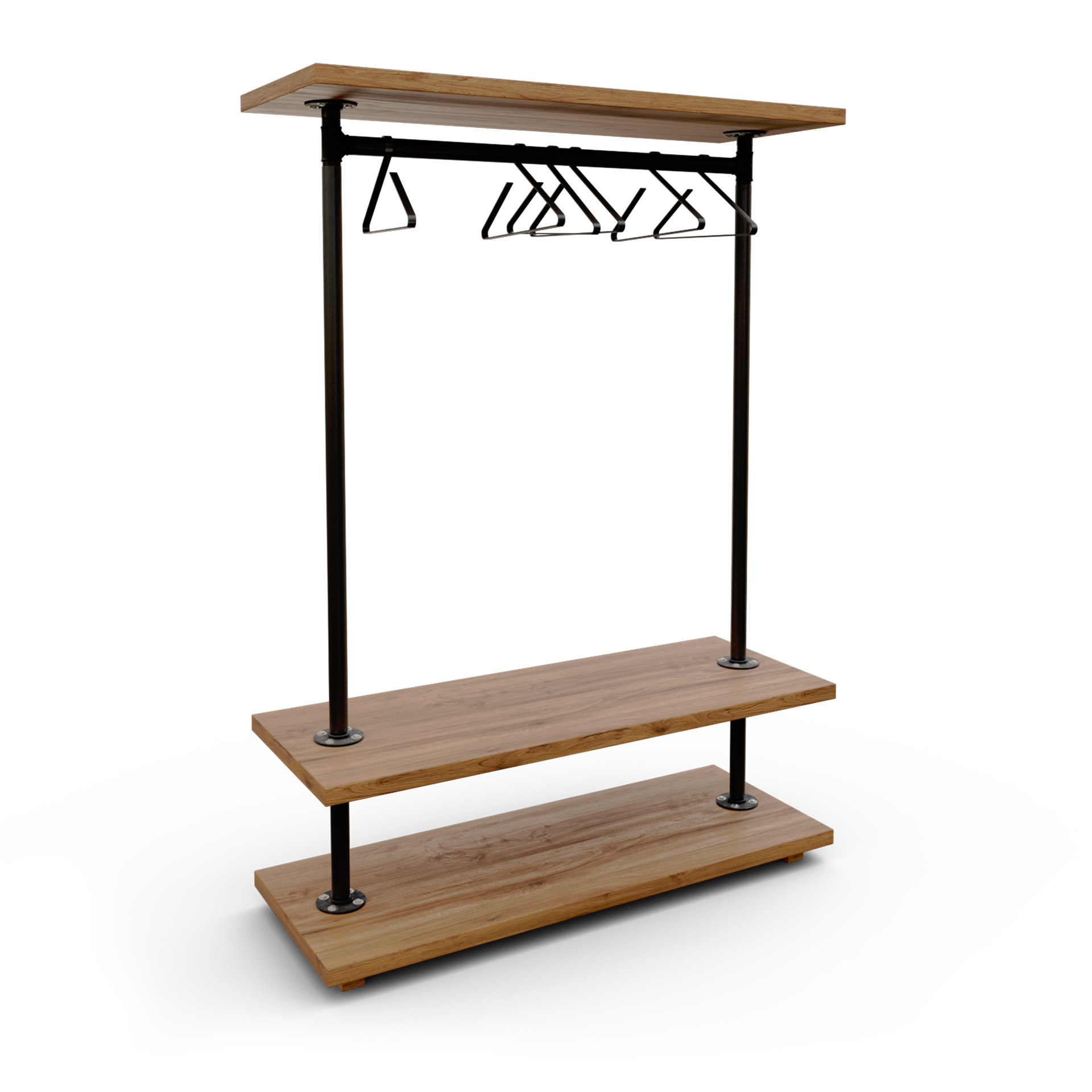 Fabricado a mano en España. Estructura autoportante en tubería metálica con barra superior de colgado situada bajo una tapa expositora de madera maciza natural (ideal para producto, rótulos o decorado) y dos baldas inferiores de madera maciza para folded, calzado o cestas. Conjunto muy estable, pensado para uso intensivo en tienda, showroom, pop-up o vestidor doméstico: acceso 360º, reposición rápida y estética profesional industrial cálido/loft. Acabados de madera en mate al agua de baja emisión para tacto natural y fácil limpieza.