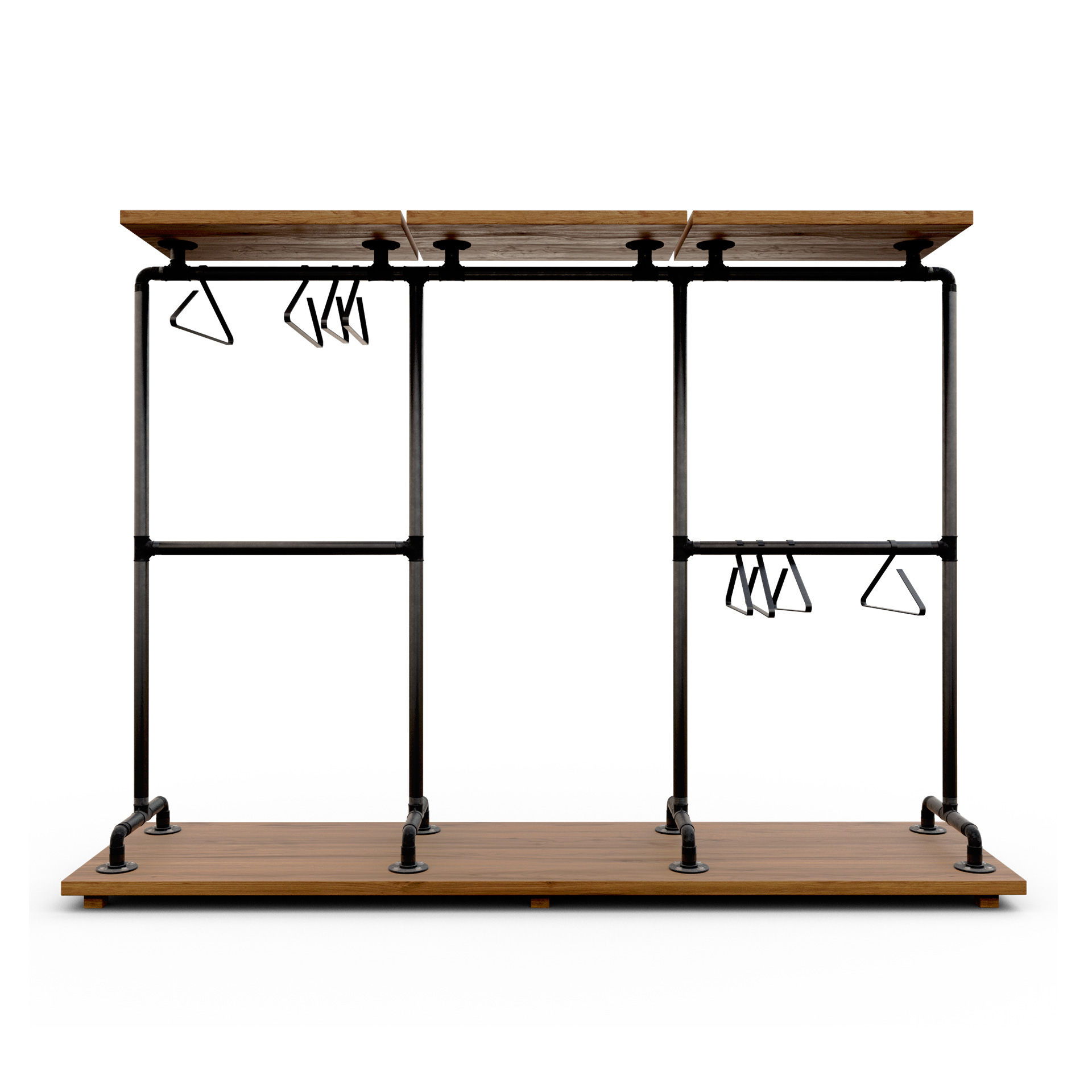 Módulo expositivo madera + metal de tres cuerpos sobre plataforma continua: cada vano dispone de barra de colgado independiente y sobrerrepisa superior corrida para plegado o atrezzo. Diseñado para uso intensivo en retail y vestidor, optimiza lineal y visibilidad manteniendo la tienda ordenada.