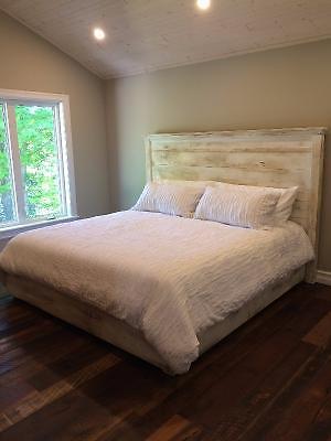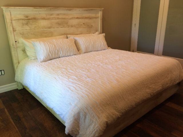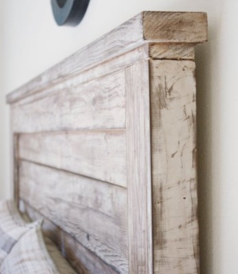 Lo fabricamos a medida para tu cama: adaptamos la anchura exacta (individual, matrimonio, queen, king o medida especial), la altura visible, el grosor del panel, el tipo de canto y el nivel de decapado (más suave, más marcado o en otro color). También podemos trabajar alternativas como blanco roto más uniforme, tono natural aceitado mate, lavado gris o efecto envejecido más intenso. Todos los acabados se realizan con tintes al agua de baja emisión y barniz mate al agua para un tacto agradable y fácil limpieza.