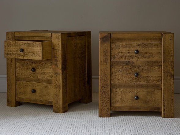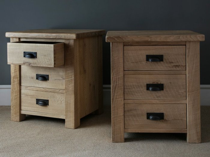 Personalizamos alto, ancho y fondo, el tipo de guía (cierre suave opcional), el tirador (negro, latón envejecido, acero cepillado…), el canto (recto o suavizado) y el acabado: natural aceitado, barniz mate al agua de baja emisión, tonos nogal/ahumado, pátina envejecida o blanco roto. Si lo necesitas, integramos pasacables oculto para cargadores y dejamos preinstalación para iluminación o regletas en la trasera. La pieza se puede fabricar sola o en pareja coordinada para dormitorios de matrimonio, manteniendo continuidad de veta y tono.