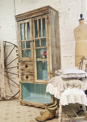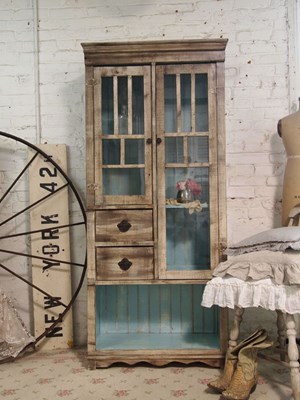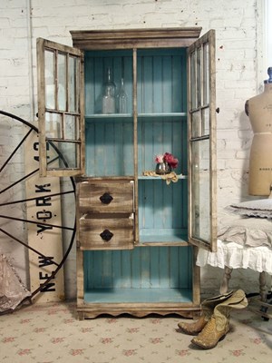 Alacena artesanal fabricada a mano en España con madera maciza con frente superior acristalado (cuarterones), dos cajones intermedios y espacio inferior abierto para piezas voluminosas. La vitrina de la imagen acabada con turquesa/aguamarina realza la exposición de vajilla y objetos, mientras que la pátina exterior mantiene un carácter rústico moderno fácil de integrar. Estructura ensamblada y estabilizada para soportar uso diario sin alabeos; baldas regulables de alta carga si la anchura de la pieza lo requiere y herrajes robustos.