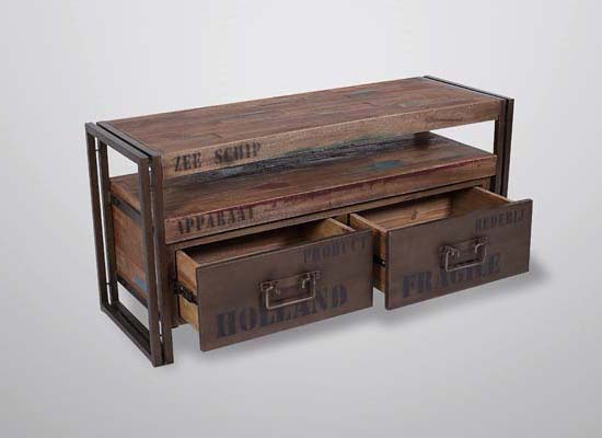 Mueble audiovisual artesanal fabricado a mano en España con madera maciza con estética industrial cálida. La pieza de la imagen incorpora doble sobre (una alzada superior que eleva la pantalla o permite colocar barra de sonido) y tres cajones frontales con frente de chapa metálica (o madera) y tiradores metálicos, ideales para organizar mandos, cables y accesorios. La estructura está estabilizada para soportar peso y uso diario sin deformaciones, con acabados mate al agua de baja emisión para un tacto natural y fácil mantenimiento.