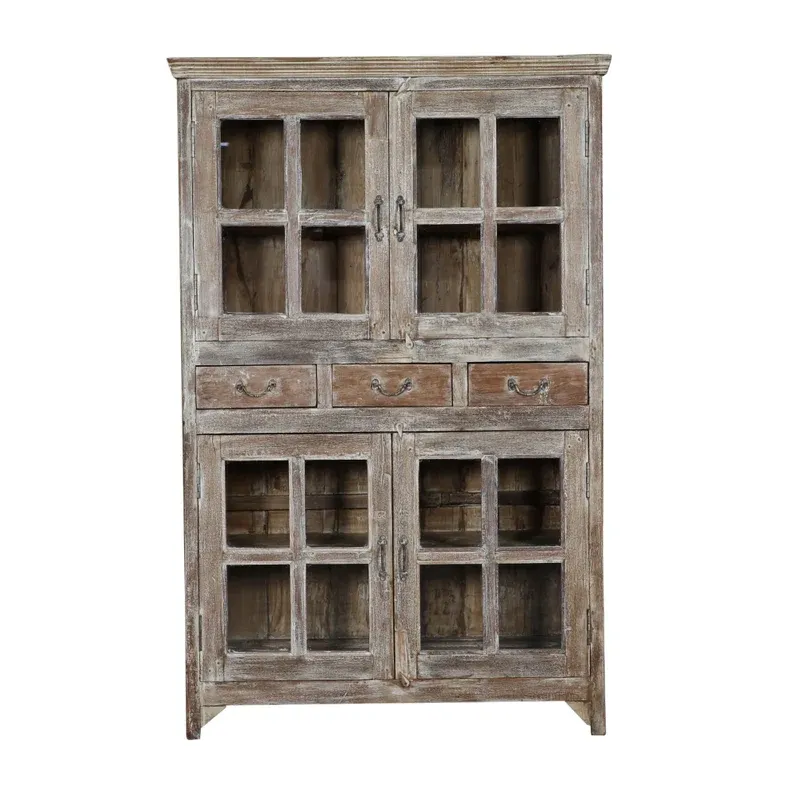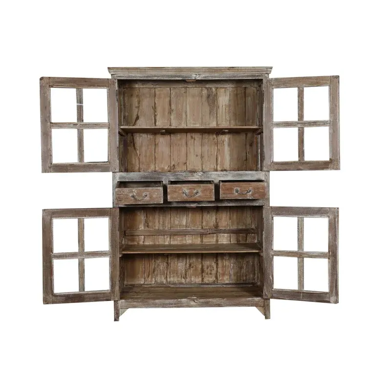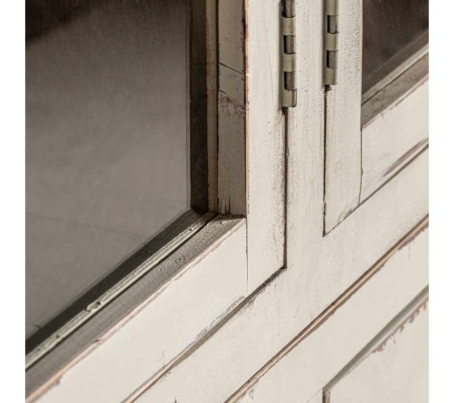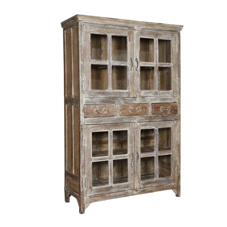 Esta vitrina-alacena artesanal fabricada a mano combina funcionalidad, durabilidad y una estética atemporal. La estructura en madera maciza natural se ensambla y estabiliza para soportar el uso diario intenso. Integra cuatro puertas acristaladas con cuarterones (dos superiores y dos inferiores) y tres cajones centrales para organizar piezas pequeñas.